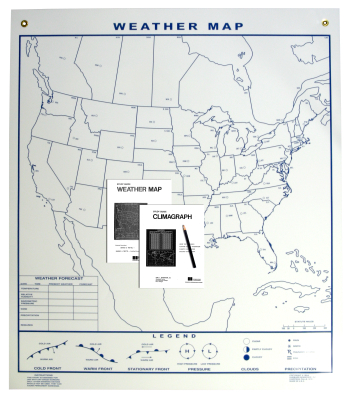 This large 44 x 50 in. markable weather chart will let your students plot weather patterns and forecast weather conditions. U.S. map outline on one side includes locations of reporting cities and world map outline on the reverse side. Includes two climagraphs for plotting comparative temperatures and precipitation.